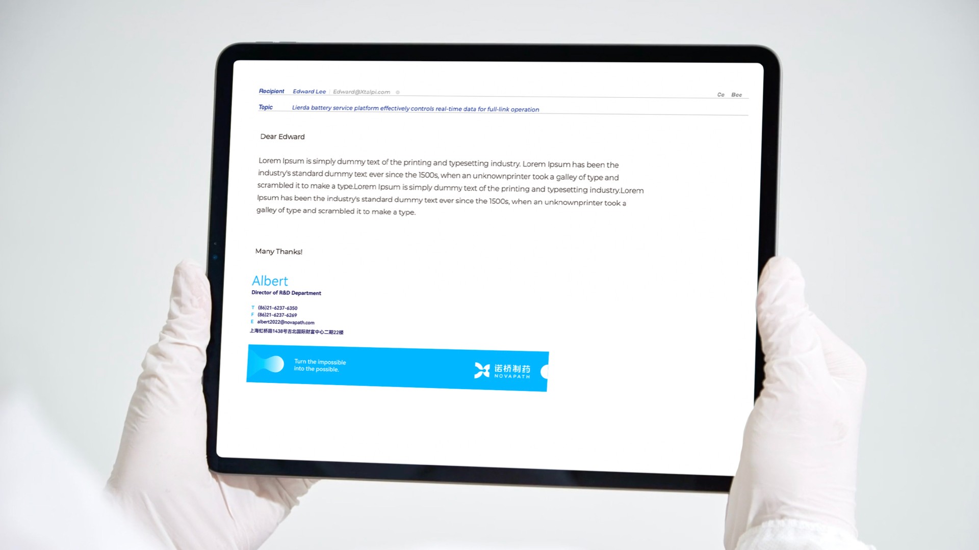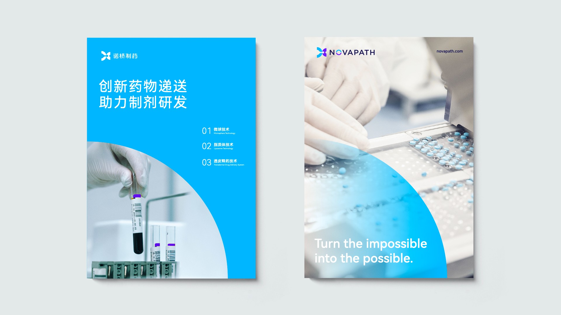 在諾橋制藥品牌塑造項目的初期,煥識團隊與諾橋內部的高層、市場相關人員進行了多次的深度訪談調研工作,深入了解到諾橋制藥努力成為中國最具價值的全球一流的藥物遞送創新技術公司的企業愿景。經共同討論,提煉出了關鍵性描述:諾橋制藥品牌就像一座橋梁連接了成功的彼岸,把已有技術發展為更好的技術,把未能達到的技術變成可能。我們在這關鍵性描述定義的指導下,為諾橋制藥提出了全新的品牌視覺概念語言:“成功新通道”。根據這一概念,我們開發了諾橋制藥品牌的視覺形象。其中,諾橋的圖形標志靈感來自于諾橋團隊分享的科研資料中“脂質體技術”在靶向給藥過程中的藥物分子遞送狀態,我們進一步對此抽象概念語言進行了可視化的具像呈現。用左右兩邊半圓之中的液體流動輪廓表現了在藥物遞送過程中有方向性的、具有穿透感的藥物遞送瞬間。同時此圖形標志整體也構成了字母“N”的形狀,賦予諾橋制藥(NOVAPATH)更多的品牌專屬性和識別性。